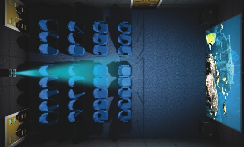 At designated times, a spray of water falls upon the audience. Spray intervals, direction, and intensity are regulated according to the requirements of the film being shown.