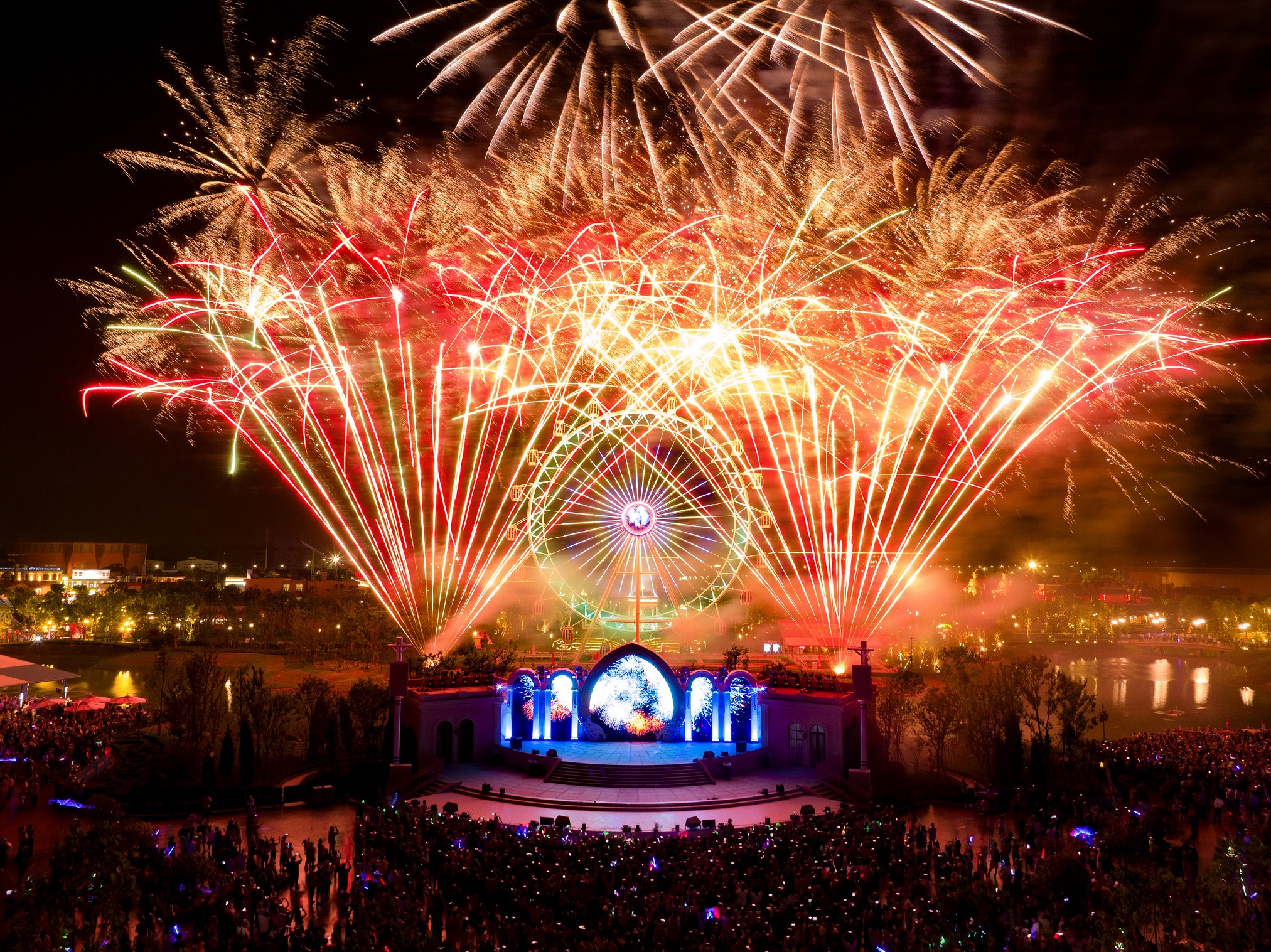 龍騰喜悅迎新春,花燈福耀中國(guó)年。春節將(jiāng)近,全國(guó)17省30餘座方特主題樂園張燈結彩、煥然一新,推出巨型花燈、廟會(huì)集市、民俗演出、無人機煙花秀等年味十足的迎春盛典,打造“神龍獻瑞”“雲上天宮”“龍躍鳳鳴”等一系列龍年主題的巨型花燈,并延長(cháng)營業時(shí)間,夜場連開(kāi),盛情邀請廣大遊客共度燈火璀璨的中國(guó)年。龍年送福各顯神通煙花夜場光影盛宴正逢甲辰龍年,各園區創意打造巨型花燈、璀璨焰火、無人機大秀等“龍”主題的光影盛宴。濟南方特攜磅礴大氣、栩栩如生的水上巨龍觀景花燈“神龍獻瑞”與遊客見面(miàn);荊州方特精心打造巨型懸浮龍燈點亮“雲上天宮”;蕪湖方特推出“龍躍鳳鳴”“龍騰九霄”“流韻東方”等國(guó)風燈組;淮安方特生肖主題燈組聚首亮相《圓明園》,共同開(kāi)啓流光溢彩的“龍”主題夜宴。南甯方特2000架無人機將(jiāng)變身百米神龍上演“龍騰星河..